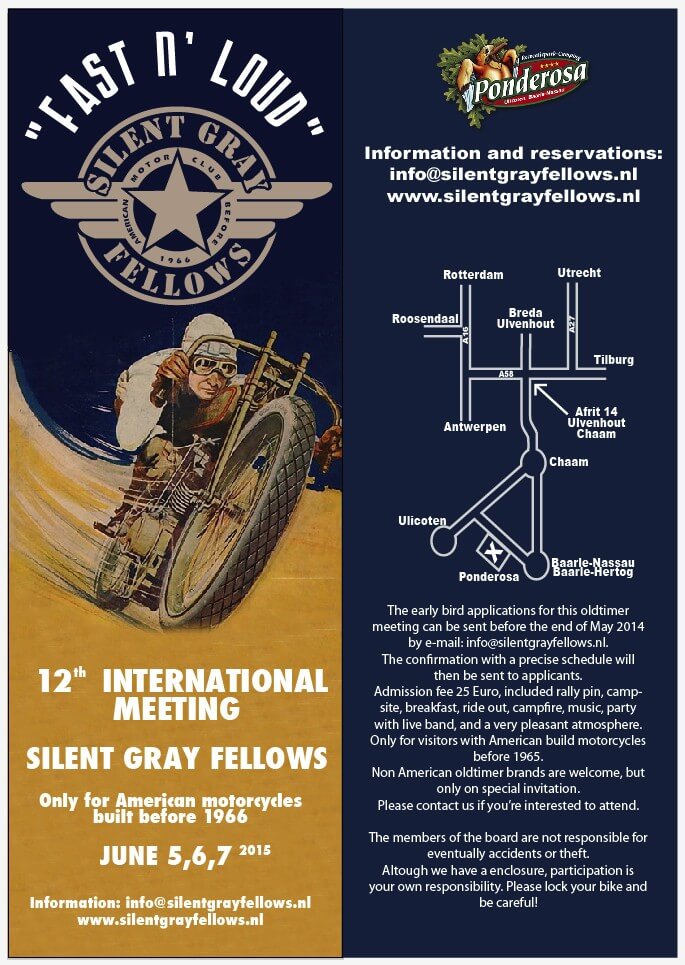 Met gepaste trots nodigen wij alle leden van jullie vereniging met motoren van voor 1966 uit om deel te nemen aan ons internationale treffen op 5, 6 en 7 juni 2015 op camping de Ponderosa te Ulicoten. In de voorgaande jaren heeft onze vereniging een goede reputatie opgebouwd met gezellige treffens en leuke activiteiten. Gewoonlijk zijn er zo’n 100 liefhebbers van oude motoren. Camping de Ponderosa is mooi gelegen, de kampeerlocatie is van alle gemakken en goed sanitair voorzien en er is een restaurant op het terrein aanwezig. Ook hebben wij een slaaptent waar tegen een schijntje een luchtbed gehuurd kan worden. En er is ruimte voor het stallen van campers en motoren jonger dan 1966.